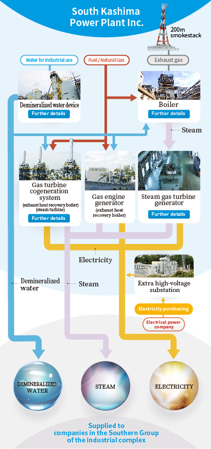 Boilers are devices that use fire, high-temperature gas, electricity or other elements as a source of energy for boiling water to create hot water or steam. South Kashima Power Plant Inc. uses the combustion heat from Natural Gas as a source for heating and generating steam. The steam is generated by applying the heat from the flames of Natural Gas to thin water pipes that pass through water. Applying additional heat (superheating) to this steam turns it into high-temperature, high-pressure steam, which is then supplied to each company for generating electricity. Our boilers have been modified to use the heat from exhaust gas to heat the air used for combustion purposes so that each company is able to use heat energy efficiently, and this has enabled us to achieve high energy efficiency rates.