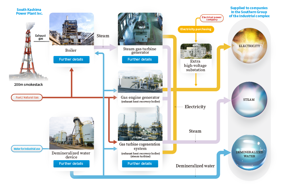 The steam generated by boilers is used to operate turbine generators and create electricity. South Kashima Power Plant Inc. operates two types of turbines: condensing turbines and back-pressure turbines. Condensing turbines cool the steam from the turbines in condensers to return it to water. Returning steam vapor to liquid water creates an almost-perfect vacuum within the condenser, which helps withdraw the exhaust from the turbine and enhances rotational driving forces, thereby increasing power generation efficiency. Back-pressure turbines use pressure levels that are higher than atmospheric pressure to withdraw and use the turbine exhaust as steam. Steam is used by client companies as a source of heat, and the overall energy efficiency from these turbines is higher than that available from condensing turbines.